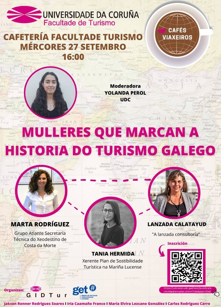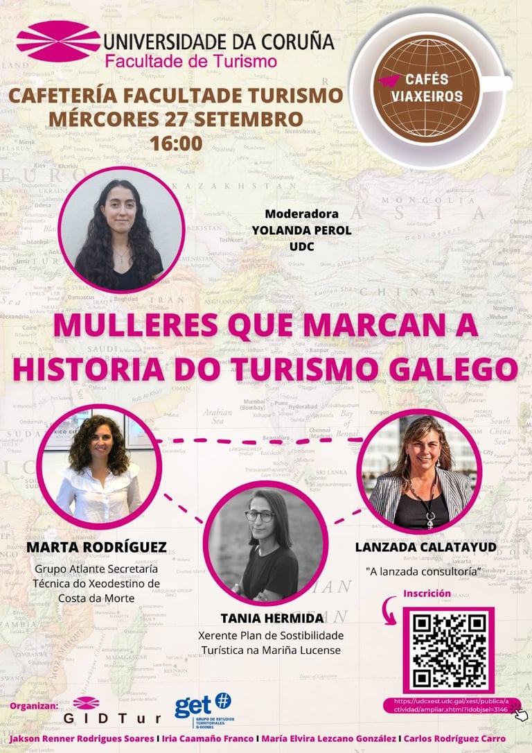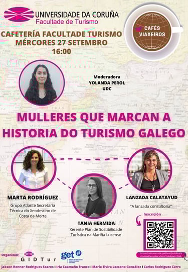 Los «Cafés Viaxeiros» de la UDC reúnen en la Facultad de Turismo a grandes profesionales del sector y con dilatada experiencia en la industria turística. Marta Rodríguez (Grupo Atlante), Tania Hermida (Gerenta A Mariña Lucense) e Lanzada Calatayud (A Lanzada Consultora) han protagonizado la mesa redonda con el título de "Mulleres que marcan a historia do turismo galego".