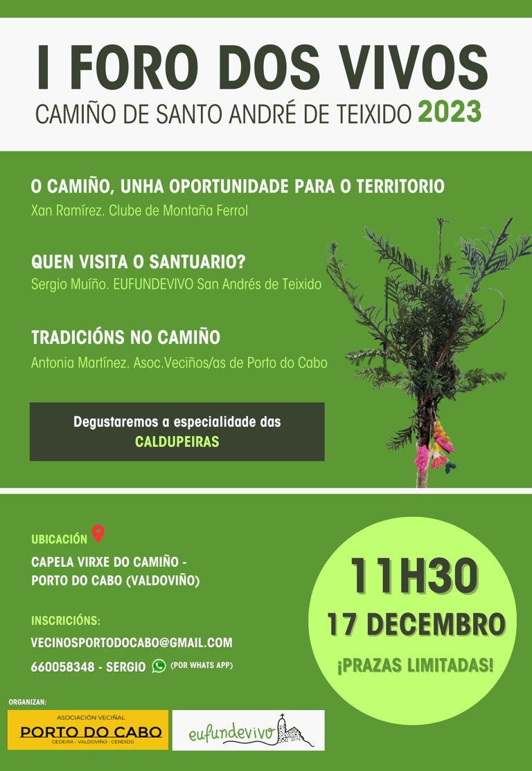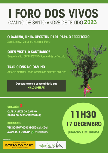 El «I Foro dos Vivos» sobre el Camino de San Andrés de Teixido tendrá lugar el próximo 17 de diciembre a las 11h30 en Porto do Cabo (Valdoviño). Este punto del Camino ha sido el elegido para albergar esta primera edición que pretende poner en valor un recursos tan importante y significativo como es la peregrinación a San Andrés.